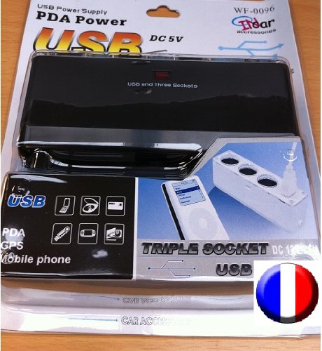 Triple socket 12 volts + un port USB 5 Volts 500mA pour recharger tous les produits necessitant un port USB. PDA,GPS,iPod,Telephone mobile, etc....